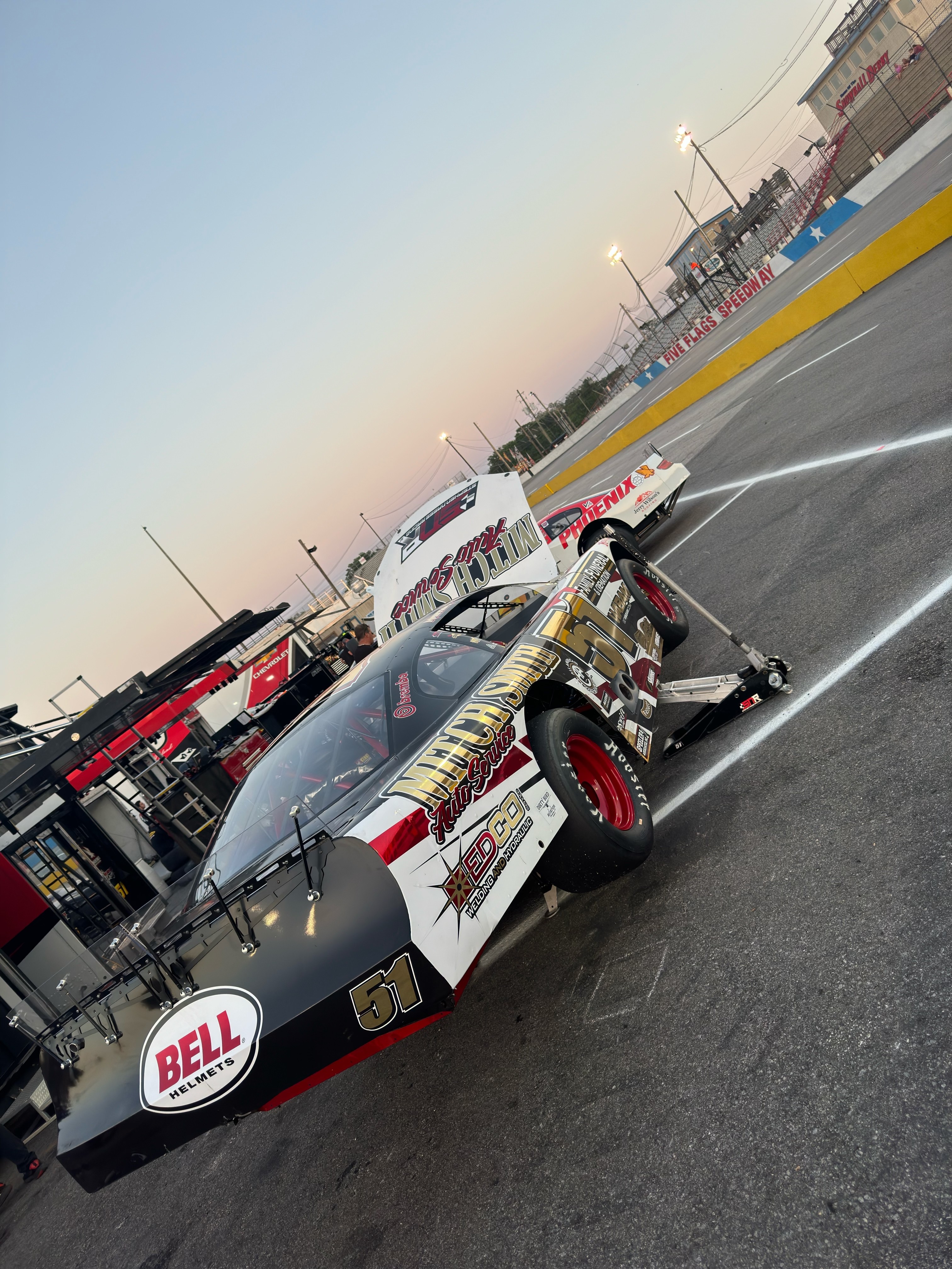 Stephen Nasse featured in Victory Lane at the Show Me The Money Feature in Montgomery Late Model Doubleheader in front of the #51 Machine